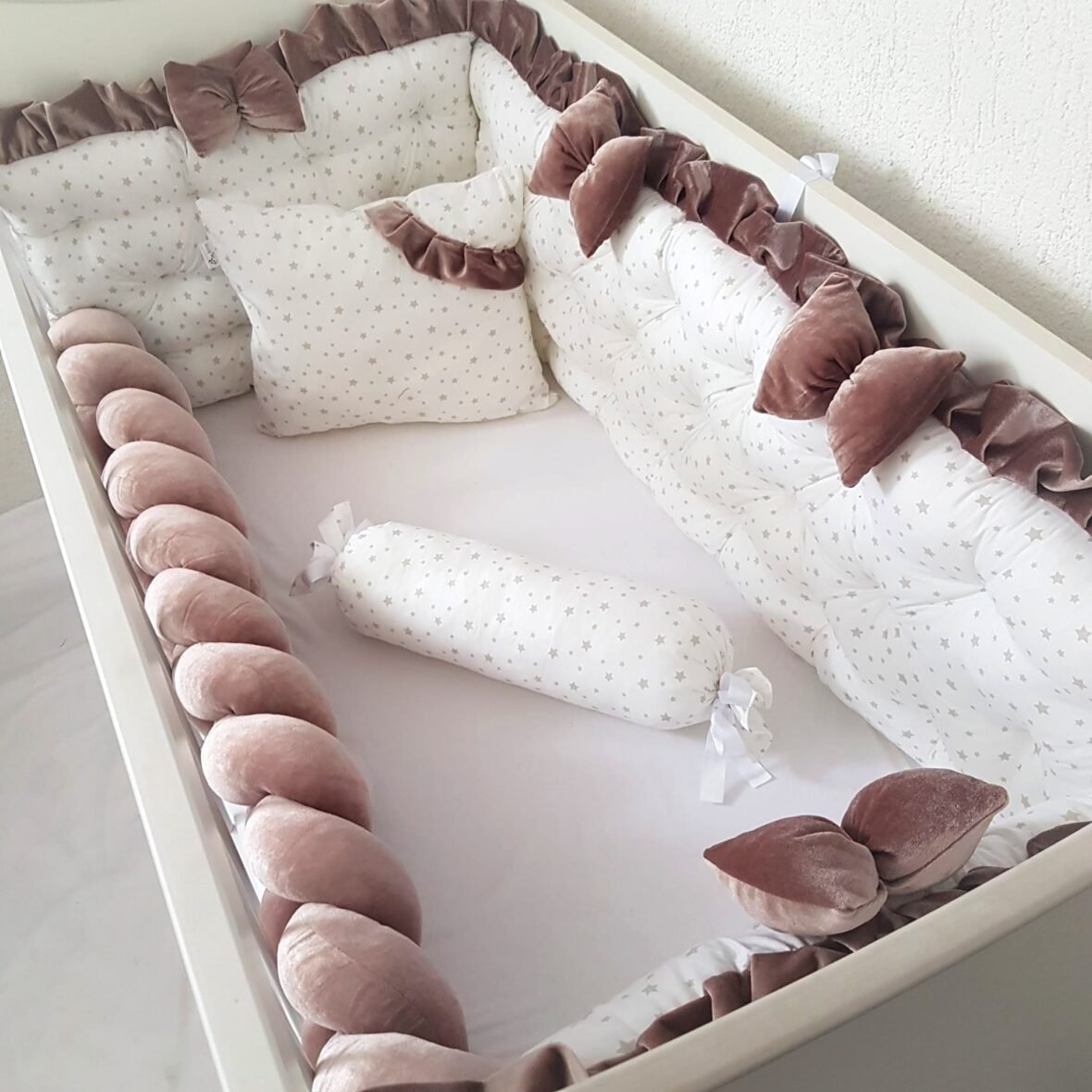 Нашите изработки се за креветчиња со димензии 60×120, но можеме да ги изработиме и по ваши димензии и бои,