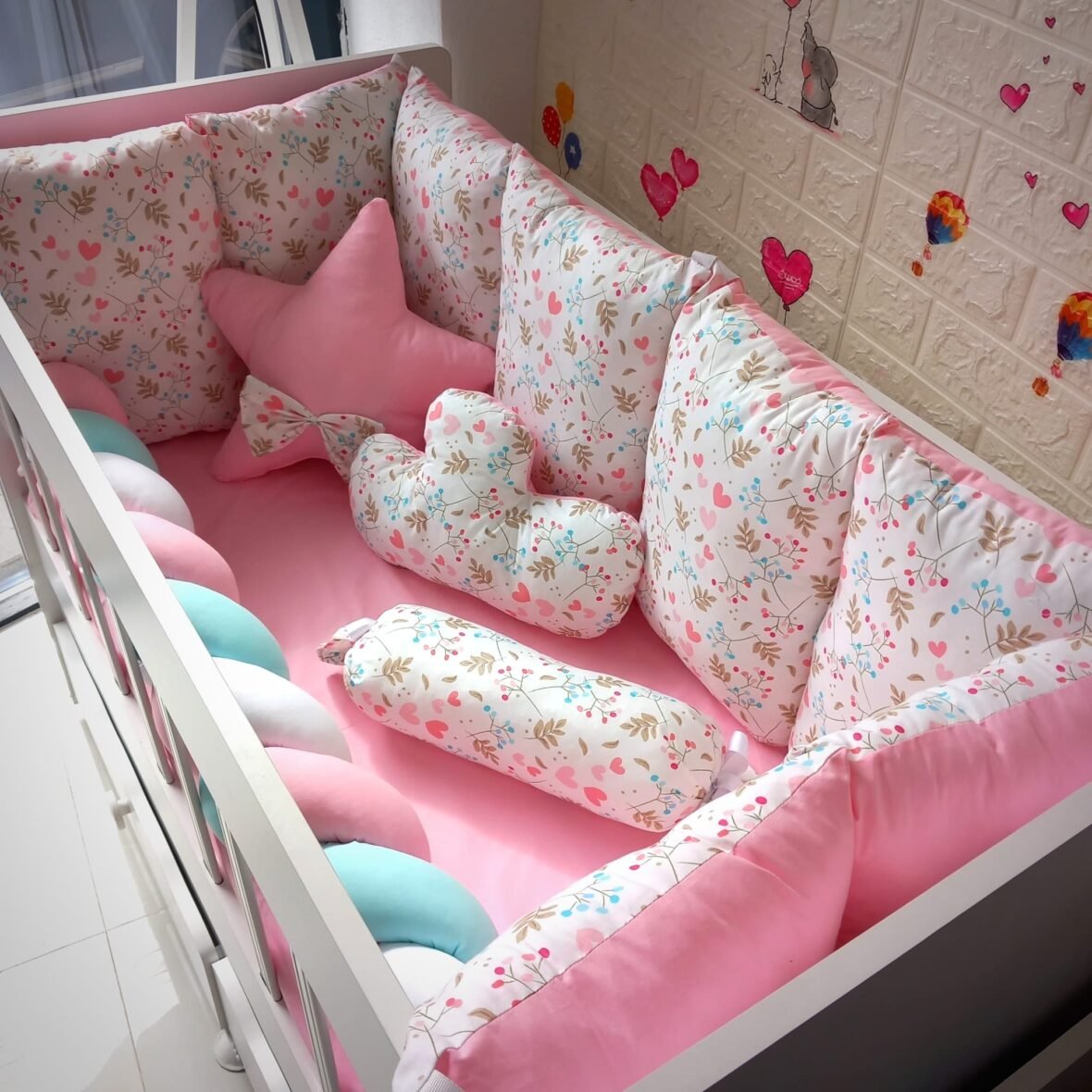 Сетот содржи двострана оградица за три страни, плетенка, чаршафче и тру украсни перничиња.