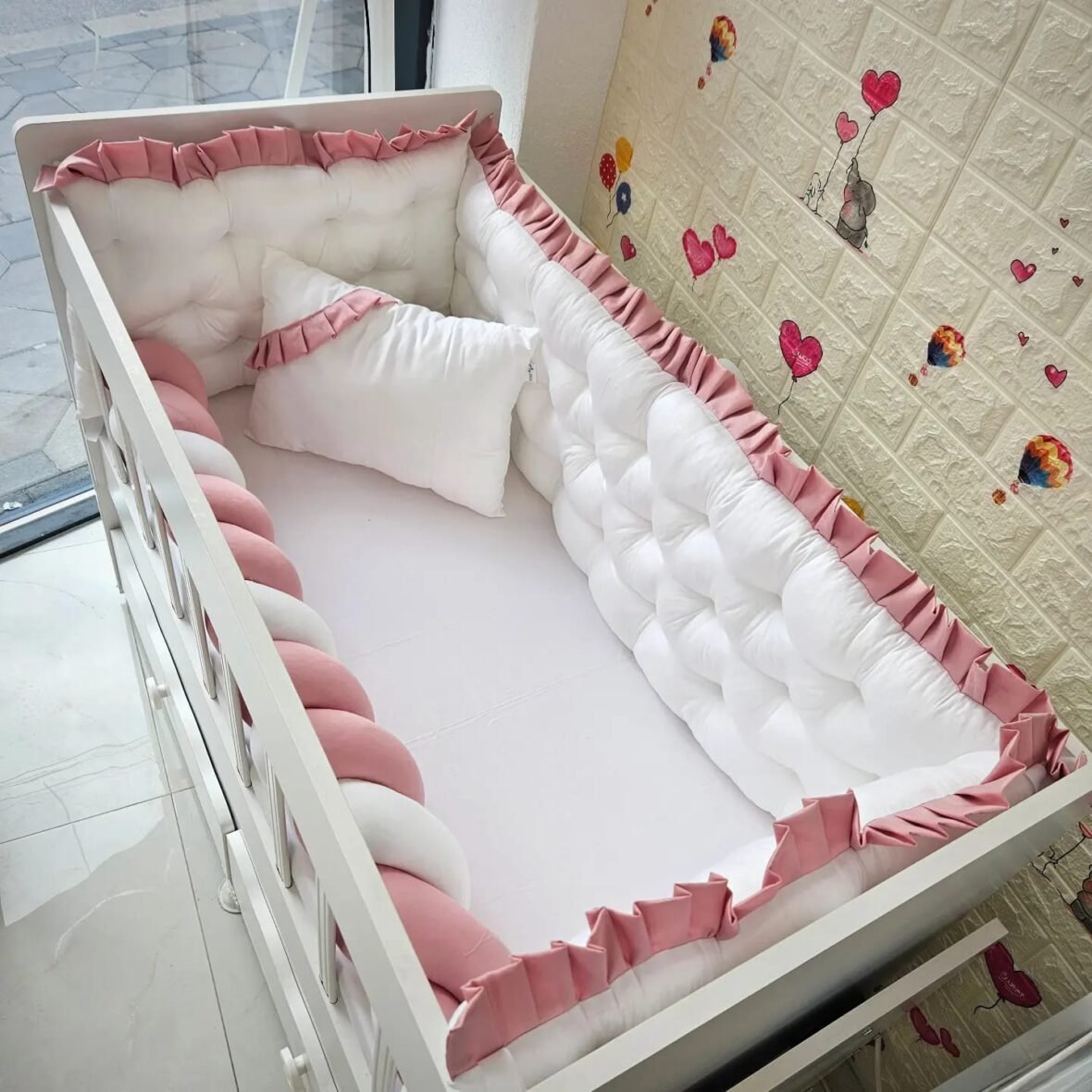 Нашите изработки се за креветчиња со димензии 60×120, но можеме да ги изработиме и по ваши димензии и бои,